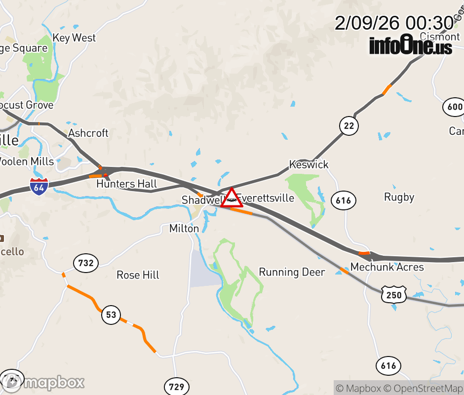 On I-64 at mile marker 127 in the County of Albemarle, motorists can expect delays due to a vehicle crash. The west right shoulder is closed. ![]() |
