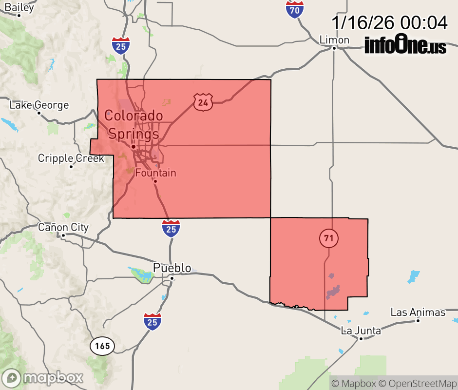 Canceled 1/16/26 3:58 AM High Wind Warning issued January 15 at 10:03PM MST until January 16 at 5:00PM MST by NWS Pueblo CO * WHAT... North winds 25 to 35 mph with gusts up to 60 mph. * WHERE... Southern El Paso, and Crowley. * WHEN... Until 5 PM MST Friday. * IMPACTS... Damaging winds could blow down trees and power lines. Travel could be difficult, especially for high profile and light weight vehicles. ![]() |
