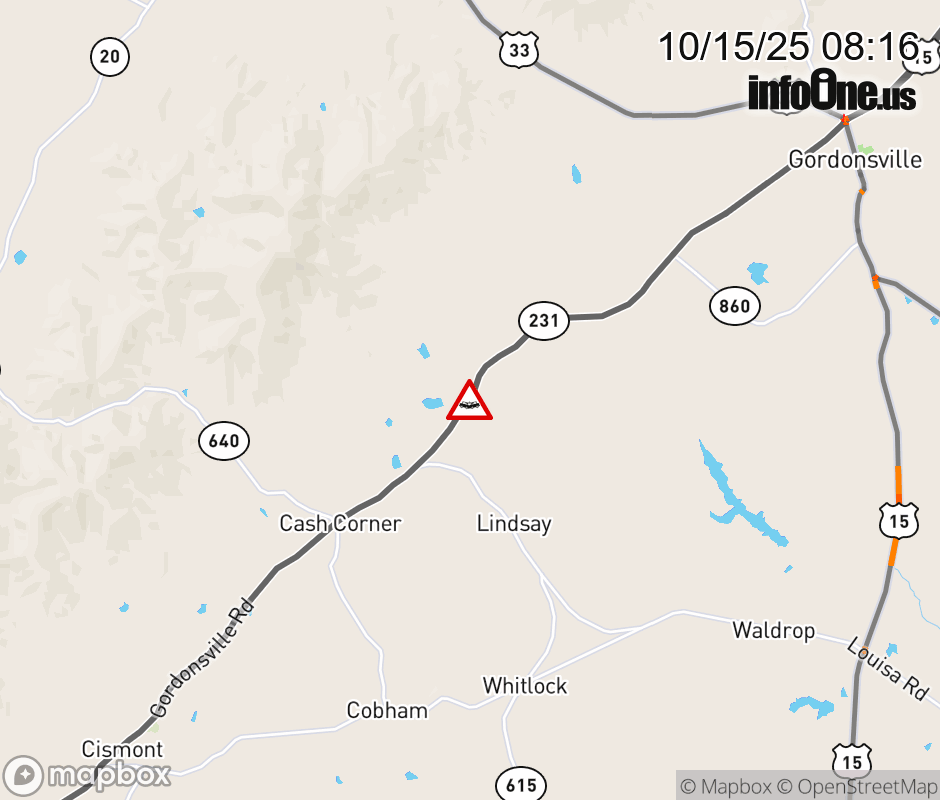 On VA-231 South in the County of Albemarle, in the vicinity of Lindsay Rd; Rt. 615N/S (Albemarle County), motorists can expect delays due to a vehicle crash. Alternating lane closures exist. Updated: Wed 10/15/25 8:16 AM EDT ![]() Updated: Wed 10/15/25 8:16 AM EDT |