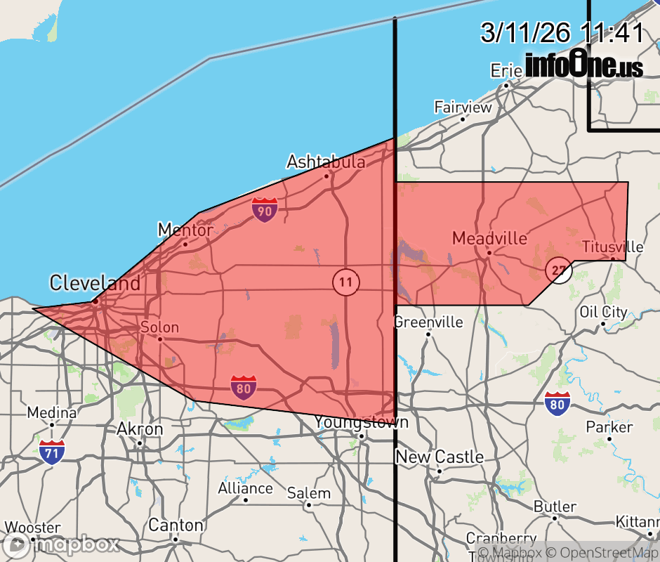 Canceled 3/11/26 12:30 PM Special Weather Statement issued March 11 at 11:40AM EDT by NWS Cleveland OH At 1140 AM EDT, Doppler radar was tracking gusty showers along a line extending from near Cleveland to near Mantua to near Cortland. Movement was northeast at 80 mph. HAZARD...Wind gusts up to 50 mph. SOURCE...Radar indicated. IMPACT...Gusty winds could knock down tree limbs and blow around unsecured objects. Locations impacted include... Cleveland, Warren, Painesville, Ashtabula, Willowick, Meadville, Conneaut, Chardon, Fairport Harbor, Geneva-On-The-Lake, Parma, Lakewood, Euclid, Mentor, Cleveland Heights, Westlake, Solon, Willoughby, Hudson, and Niles. ![]() |