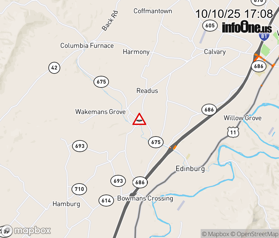 On Rt. 679 in the County of Shenandoah, in the vicinity of Stoney Creek Rd; Rt. 675E/W (Shenandoah County), motorists can expect delays due to a tractor trailer crash. All north lanes are closed. All south lanes are closed. ![]() |