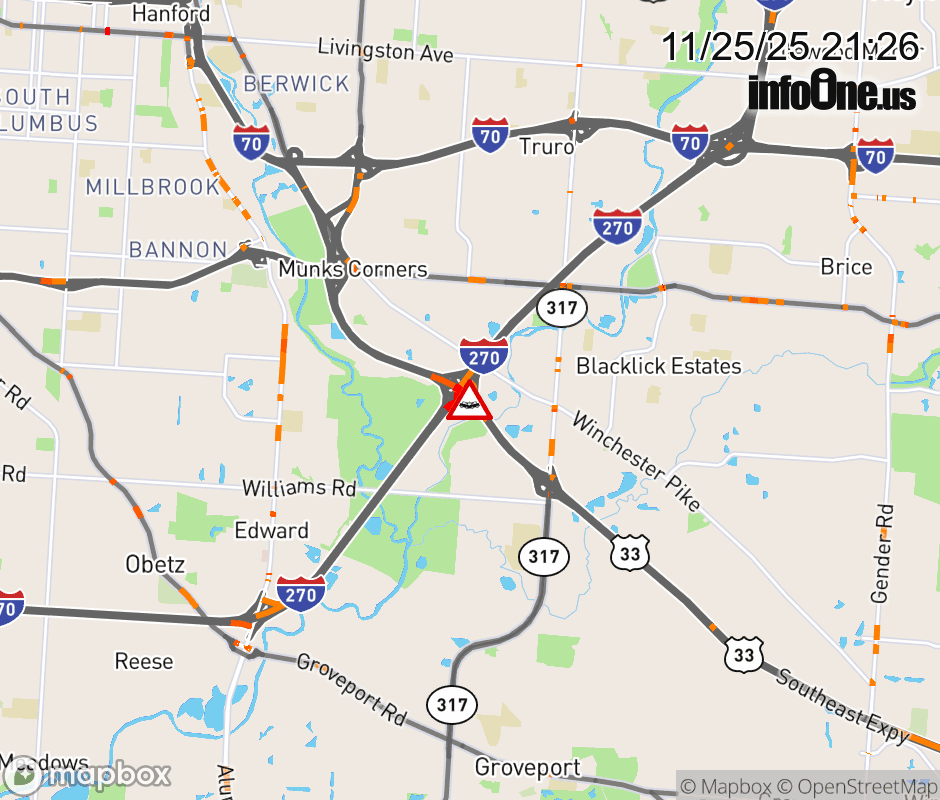 The left lane is blocked on US-33 East at I-270 North, due to a crash. ![]() |