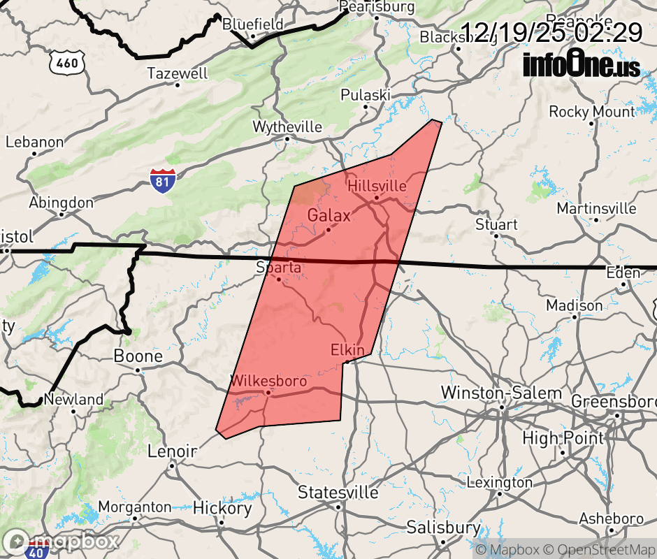 Canceled 12/19/25 3:00 AM Special Weather Statement issued December 19 at 2:27AM EST by NWS Blacksburg VA At 226 AM EST, Doppler radar was tracking gusty showers along a line extending from Gunton Park to Cricket. Movement was east at 45 mph. HAZARD...Wind gusts up to 40 mph. SOURCE...Radar indicated. IMPACT...Gusty winds could knock down tree limbs and blow around unsecured objects. Locations impacted include... Galax... North Wilkesboro... Elkin... Wilkesboro... Hillsville... Sparta... and Dobson. ![]() |