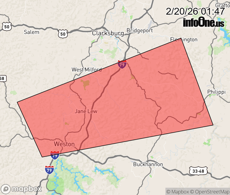 Canceled 2/20/26 2:00 AM Special Weather Statement issued February 20 at 1:45AM EST by NWS Charleston WV At 145 AM EST, Doppler radar was tracking a strong thunderstorm near Jackson Mill, or 7 miles northeast of Weston, moving east at 55 mph. HAZARD...Wind gusts up to 40 mph and half inch hail. SOURCE...Radar indicated. IMPACT...Gusty winds could knock down tree limbs and blow around unsecured objects. Minor hail damage to vegetation is possible. Locations impacted include... Weston, Jackson Mill, Lost Creek, Jane Lew, Volga, Hodgesville, and Century. This includes Interstate 79 between mile markers 99 and 114. ![]() |