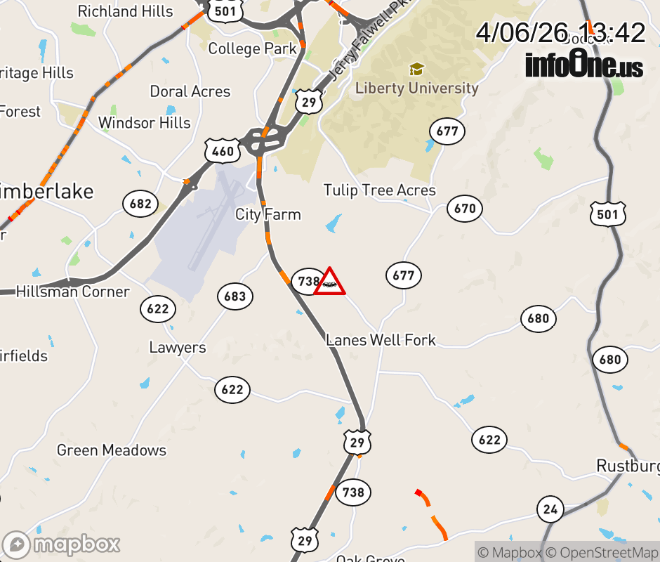 On Rt. 738 in the County of Campbell, in the vicinity of Wards Rd; US-29N, motorists can expect delays due to a vehicle crash. All north lanes are closed. All south lanes are closed. Updated: Mon 4/6/26 1:42 PM EDT ![]() Updated: Mon 4/6/26 1:42 PM EDT |