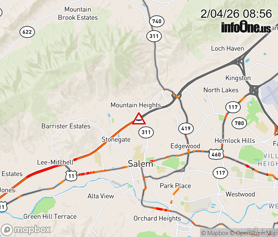 On I-81 North at mile marker 140.2 in the County of Roanoke, motorists can expect delays due to a vehicle crash. Traffic backups are approximately 1.0 mile. Updated: Wed 2/4/26 8:56 AM EST ![]() Updated: Wed 2/4/26 8:56 AM EST |
