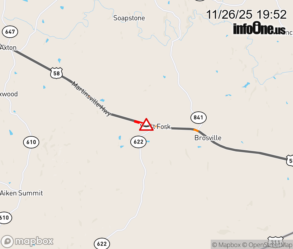 On US-58 East in the County of Pittsylvania, in the vicinity of Cascade Rd; Rt. 622N/S (Pittsylvania County), motorists can expect delays due to a vehicle crash. Lane closures exist. ![]() |