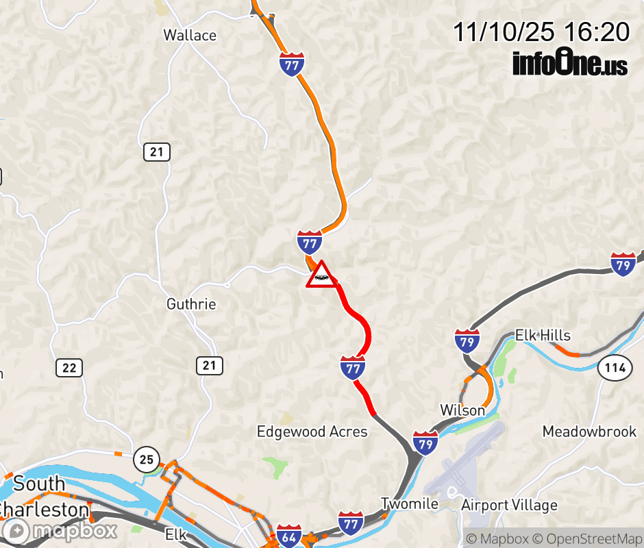 Vehicle Crash on I-77N at Mile Marker 106.0. The northbound road is closed. Comments:Traffic Detouring at MM 106 Exit onto CR-21 (Sissonville Dr). Updated: Mon 11/10/25 4:20 PM EST ![]() Updated: Mon 11/10/25 4:20 PM EST |