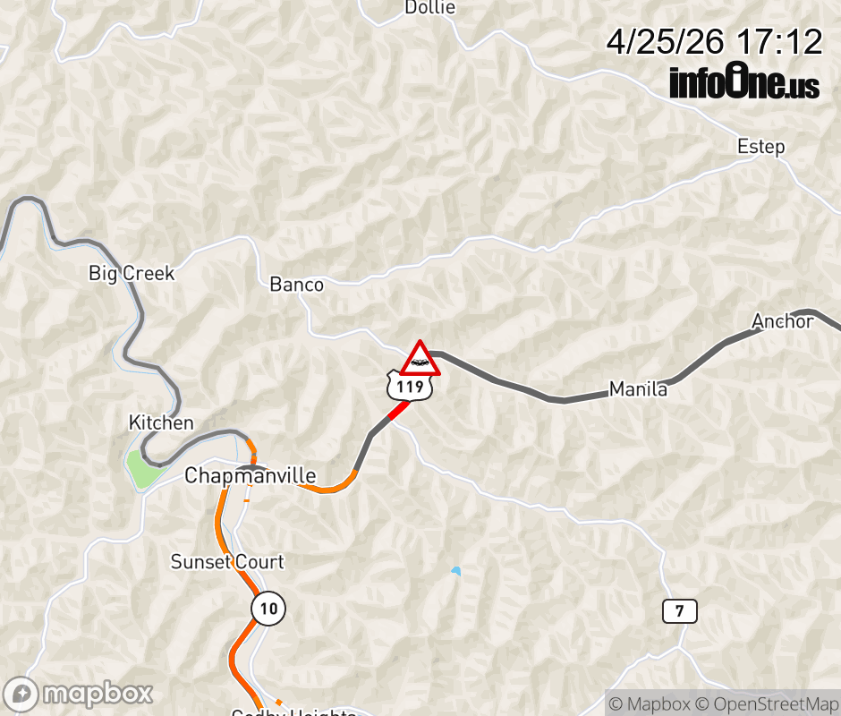 Vehicle Crash on US-119N near Trace Fork Exit. Updated: Sat 4/25/26 5:12 PM EDT ![]() Updated: Sat 4/25/26 5:12 PM EDT |
