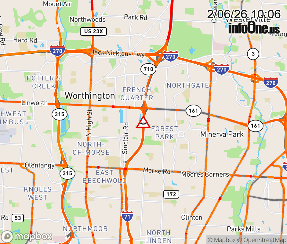 The right lane is blocked on I-71 South beyond SR-161/Dublin Granville Rd, due to a crash. Updated: Fri 2/6/26 10:06 AM EST ![]() Updated: Fri 2/6/26 10:06 AM EST |