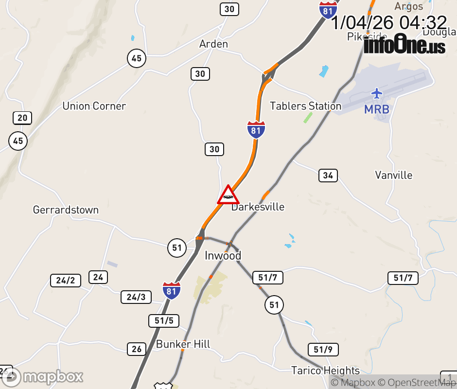 Vehicle Crash on I-81S at Mile Marker 6.0. The southbound road is closed. Updated: Sun 1/4/26 4:32 AM EST ![]() Updated: Sun 1/4/26 4:32 AM EST |