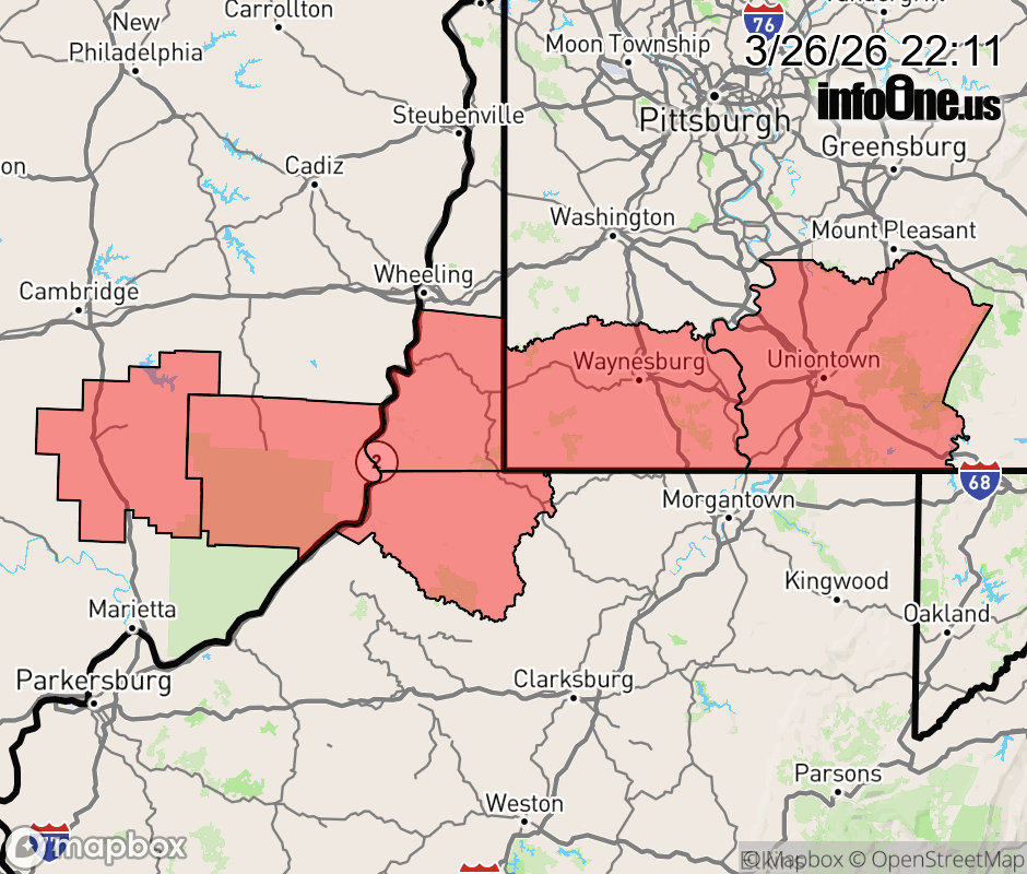 Canceled 3/26/26 10:53 PM Tornado Watch issued March 26 at 10:09PM EDT until March 26 at 11:00PM EDT by NWS Pittsburgh PA THE NATIONAL WEATHER SERVICE HAS EXTENDED TORNADO WATCH 75 TO INCLUDE THE FOLLOWING AREAS UNTIL 11 PM EDT THIS EVENING IN OHIO THIS WATCH INCLUDES 2 COUNTIES IN EAST CENTRAL OHIO MONROE NOBLE IN PENNSYLVANIA THIS WATCH INCLUDES 2 COUNTIES IN SOUTHWEST PENNSYLVANIA FAYETTE GREENE IN WEST VIRGINIA THIS WATCH INCLUDES 2 COUNTIES IN NORTHERN WEST VIRGINIA WETZEL IN THE NORTHERN PANHANDLE OF WEST VIRGINIA MARSHALL THIS INCLUDES THE CITIES OF CALDWELL, CONNELLSVILLE, MASONTOWN, MOUNDSVILLE, NEW MARTINSVILLE, UNIONTOWN, WAYNESBURG, AND WOODSFIELD. ![]() |