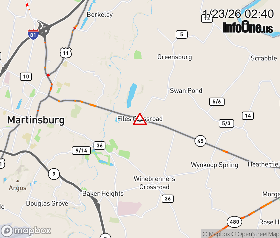 Vehicle Crash on WV-45 ( Greensburg Rd / Shepherdstown Rd). The northbound road is closed. The southbound road is closed.