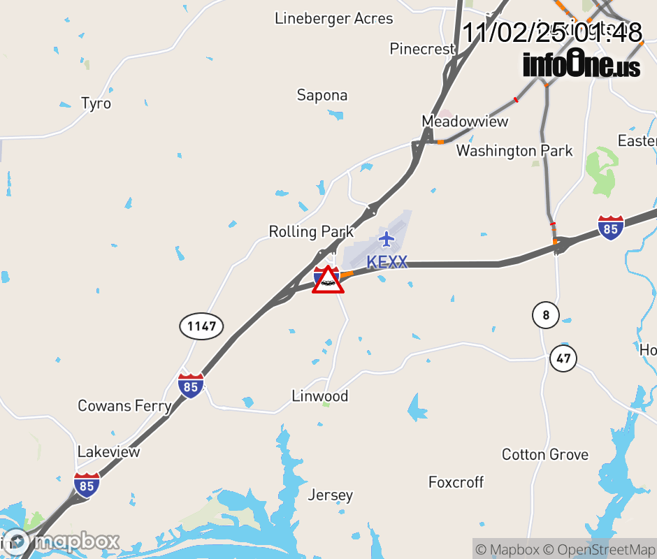 The outside lanes are closed near Exit 88 (NC 47). Updated: Sun 11/2/25 1:48 AM EDT ![]() Updated: Sun 11/2/25 1:48 AM EDT |