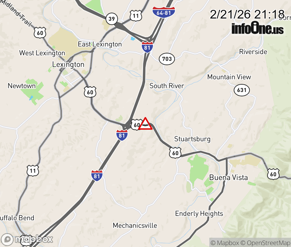 On US-60 East in the County of Rockbridge, in the vicinity of FR-879N/S, motorists can expect delays due to a vehicle crash. Updated: Sat 2/21/26 9:18 PM EST ![]() Updated: Sat 2/21/26 9:18 PM EST |