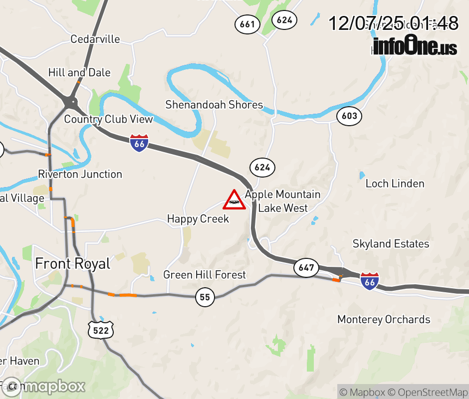 On Rt. 624 in the County of Warren, in the vicinity of Dismal Hollow Rd; Rt. 647N/S (Warren County), motorists can expect delays due to a vehicle crash. All north lanes are closed. All south lanes are closed. ![]() |