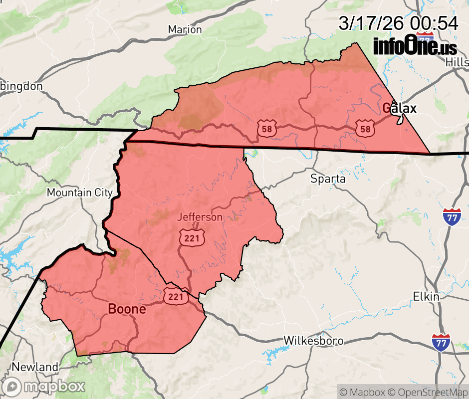 Canceled 3/17/26 8:00 AM Winter Weather Advisory issued March 17 at 12:53AM EDT until March 17 at 8:00AM EDT by NWS Blacksburg VA * WHAT... Snow Above 3500 Feet. Additional snow accumulations up to one inch. Winds gusting as high as 50 mph. * WHERE... In North Carolina, Ashe and Watauga Counties. In Virginia, Grayson County. * WHEN... Until 8 AM EDT this morning. * IMPACTS... Plan on slippery road conditions. The hazardous conditions could impact the Tuesday morning commute. Strong winds could cause tree damage. ![]() |