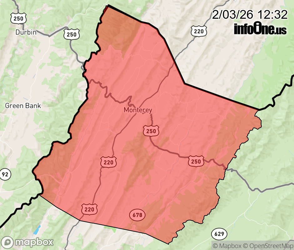 Canceled 2/3/26 5:34 PM Winter Weather Advisory issued February 3 at 12:31PM EST until February 4 at 12:00AM EST by NWS Baltimore MD/Washington DC * WHAT... Snow. Total snow accumulations of 2 to 3 inches. * WHERE... Western Highland County. * WHEN... Until midnight EST tonight. * IMPACTS... Plan on slippery road conditions. The hazardous conditions could impact the evening commute. ![]() |