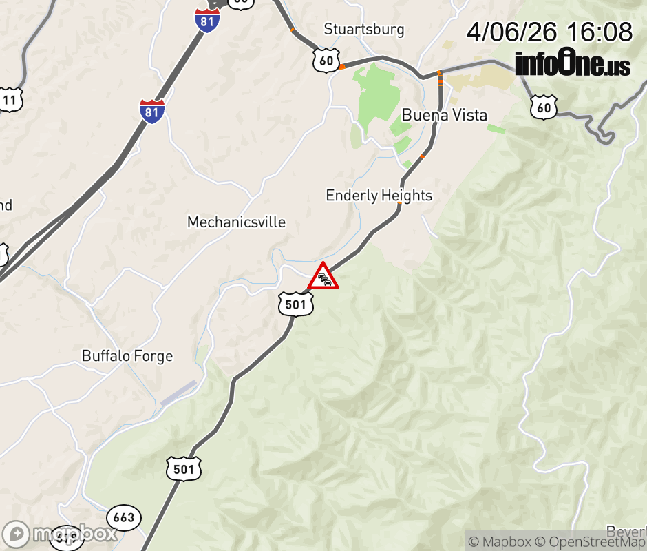 On US-501 North in the County of Rockbridge, in the vicinity of River Rd; Rt. 663N/S (Rockbridge County), motorists can expect delays due to a vehicle fire. Lane closures exist. Updated: Mon 4/6/26 4:08 PM EDT ![]() Updated: Mon 4/6/26 4:08 PM EDT |