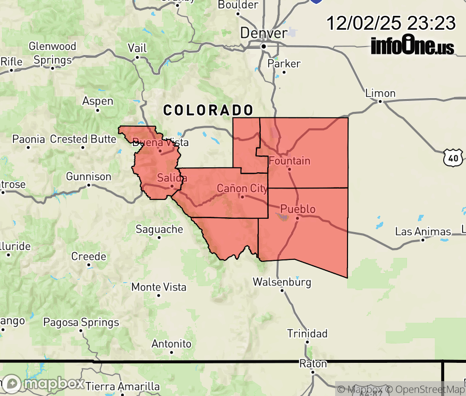 Canceled 12/3/25 2:41 AM Winter Weather Advisory issued December 2 at 9:22PM MST until December 3 at 8:00PM MST by NWS Pueblo CO * WHAT... Snow expected. Total snow accumulations between 3 and 6 inches. * WHERE... Southern El Paso, Pueblo, Central Chaffee County Below 9000 Feet, Western/Central Fremont County Below 8500 Feet, and Canon City Vicinity/Eastern Fremont County. * WHEN... From 8 AM to 8 PM MST Wednesday. * IMPACTS... Roads, and especially bridges and overpasses, will likely become slick and hazardous. Plan on slippery road conditions. The hazardous conditions could impact the Wednesday evening commute. ![]() |