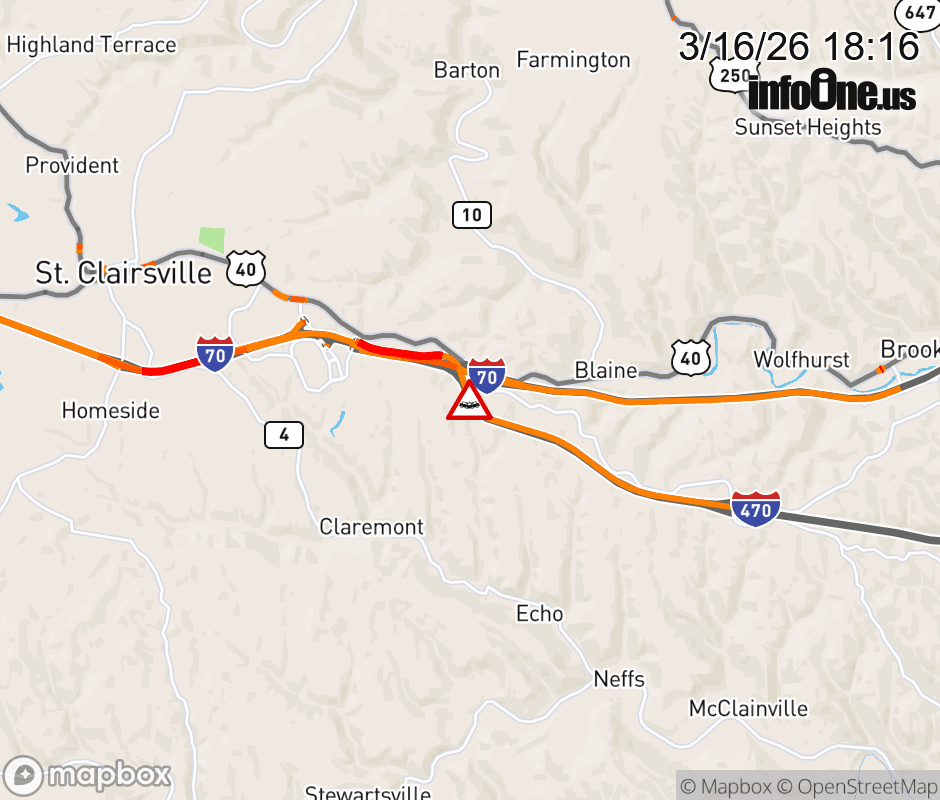 All lanes are closed on I-470 East at I-70 East expect lane closures on I-470 West beyond Bellaire-High Ridge Rd, due to a crash. ![]() |
