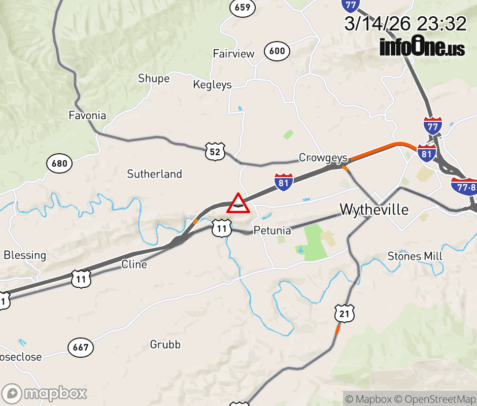 On I-81 at mile marker 68.8 in the County of Wythe, motorists can expect delays due to a vehicle crash. The north right shoulder is closed. ![]() |