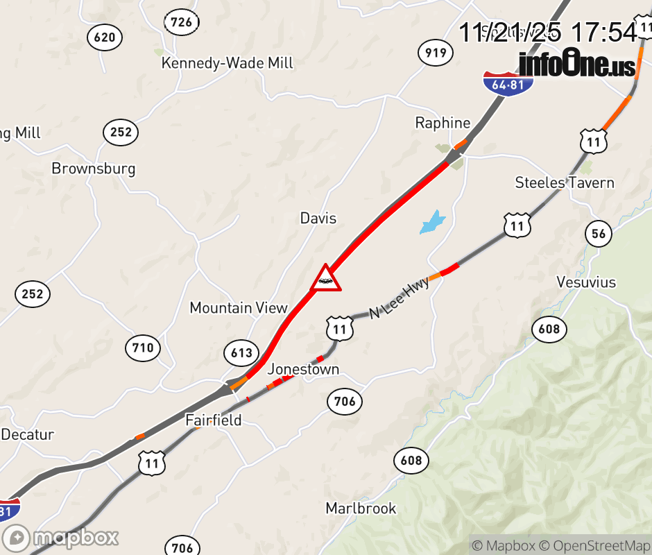 On I-81 North at mile marker 202.6 in the County of Rockbridge, motorists can expect delays due to a vehicle crash. Traffic backups are approximately 3.0 miles. Updated: Fri 11/21/25 5:54 PM EST ![]() Updated: Fri 11/21/25 5:54 PM EST |
