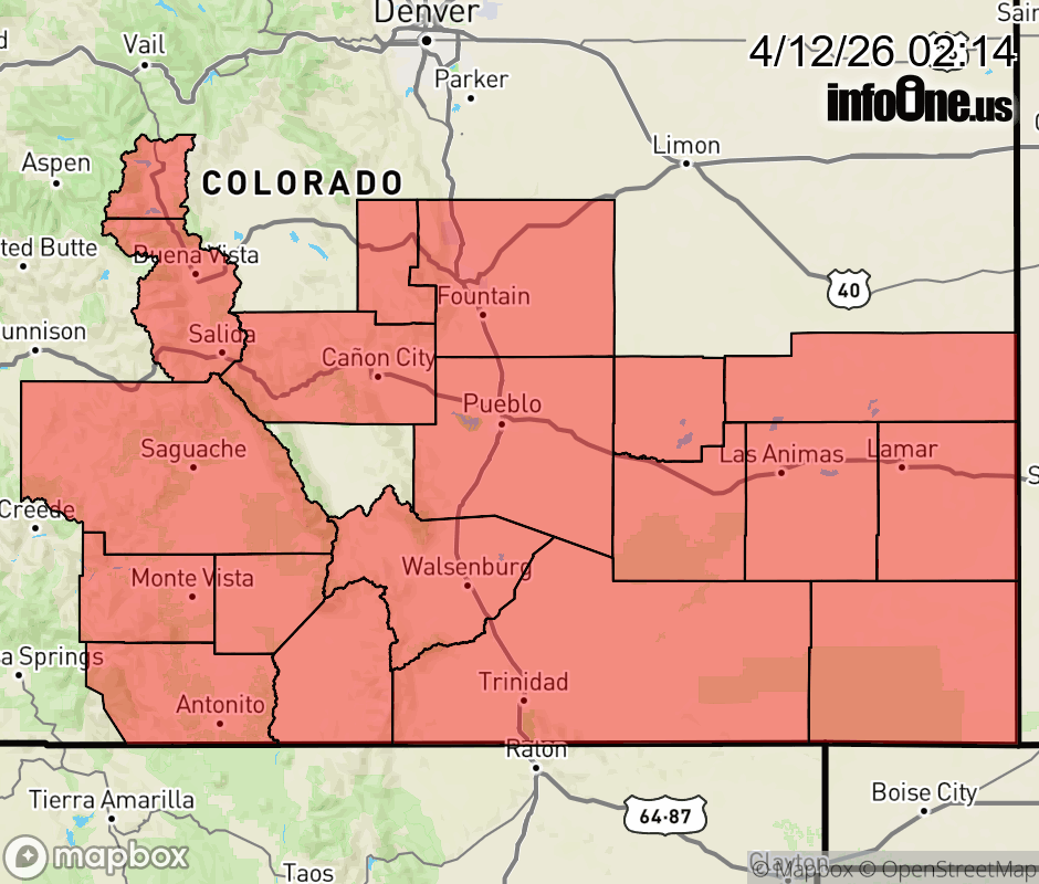 Canceled 4/12/26 4:32 PM Red Flag Warning issued April 12 at 12:12AM MDT until April 12 at 9:00PM MDT by NWS Pueblo CO ...RED FLAG WARNING IN EFFECT FROM 11 AM TO 9 PM MDT MONDAY FOR FIRE WEATHER ZONES 220, 221, 222, 224, 226, 227, 228, 229, 230, 231, 232, 233, 234, 235, 236, AND 237... The National Weather Service in Pueblo has issued a new Red Flag Warning for gusty winds and low relative humidity, which is in effect from 11 AM to 9 PM MDT Monday. The Fire Weather Watch is no longer in effect. * AFFECTED AREA... Fire Weather Zones 220, 221, 222, 224, 226, 227, 228, 229, 230, 231, 232, 233, 234, 235, 236 and 237. * TIMING... For the first Red Flag Warning, from 11 AM this morning to 9 PM MDT this evening. For the second Red Flag Warning, from 11 AM to 9 PM MDT Monday. * WINDS... Southwest 20 to 30 mph with gusts up to 45 mph. * RELATIVE HUMIDITY... As low as 7 percent. * IMPACTS... Elevated fire danger is expected. Fires will catch and spread rapidly and erratically. ![]() |