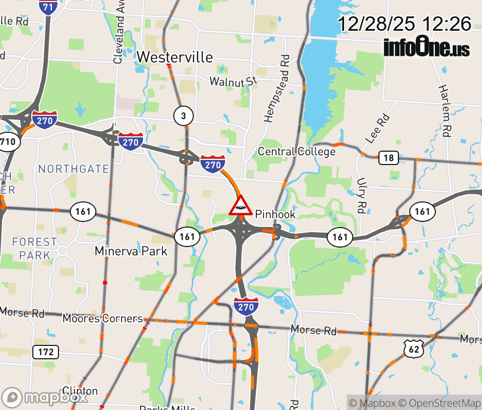 The 2 right lanes are blocked on I-270 North beyond SR-161, due to a crash. Updated: Sun 12/28/25 12:26 PM EST ![]() Updated: Sun 12/28/25 12:26 PM EST |