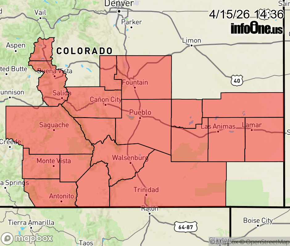 Red Flag Warning issued April 15 at 12:35PM MDT until April 16 at 11:00PM MDT by NWS Pueblo CO The National Weather Service in Pueblo has issued a Red Flag Warning for gusty winds and low relative humidity, which is in effect from 11 AM to 11 PM MDT Thursday. The Fire Weather Watch is no longer in effect. * AFFECTED AREA... Fire Weather Zones 220, 221, 222, 224, 225, 226, 227, 228, 229, 231, 232, 234, 235 and 236. * TIMING... From 11 AM to 11 PM MDT Thursday. * WINDS... Southwest 20 to 35 mph with gusts up to 60 mph over the high country, and gusts to 40 mph over the plains. * RELATIVE HUMIDITY... As low 12 percent over the high country, and as low as 6 percent over the plains. * IMPACTS... Elevated fire danger is expected. Fires will catch and spread rapidly and erratically. ![]() |