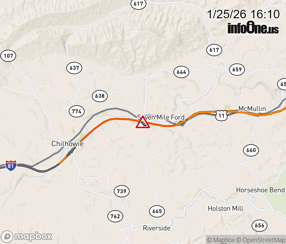 On I-81 at mile marker 38 in the County of Smyth, motorists can expect delays due to an incident. The north right lane and right shoulder are closed. ![]() |