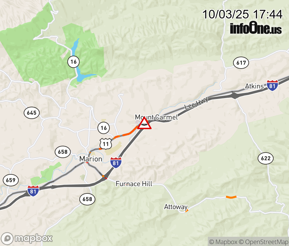 On US-11 in the County of Smyth, in the vicinity of the ramp to I-81S, motorists can expect delays due to a vehicle crash. The north left shoulder and through lanes are closed. ![]() |