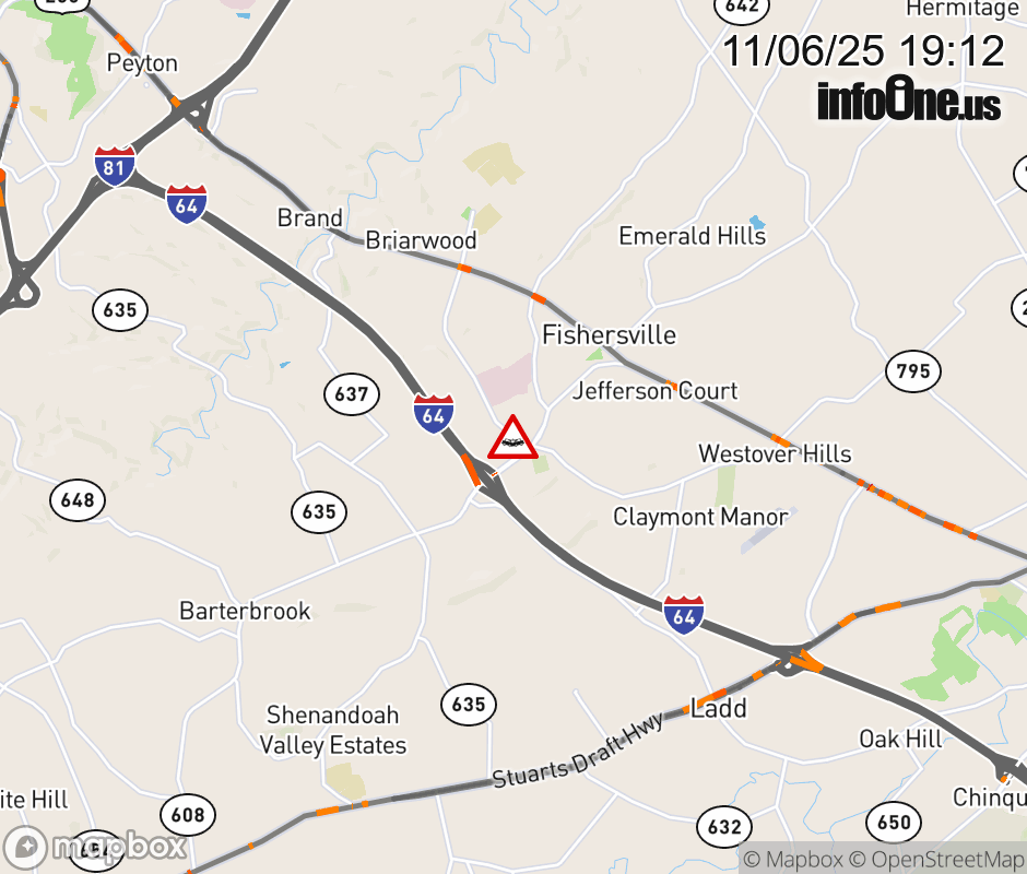 On Rt. 636 in the County of Augusta, in the vicinity of Goose Creek Rd; Tinkling Spring Rd; Rt. 640N/S (Augusta County); VA-285N/S, motorists can expect delays due to a vehicle crash. All east lanes are closed. All west lanes are closed. ![]() |