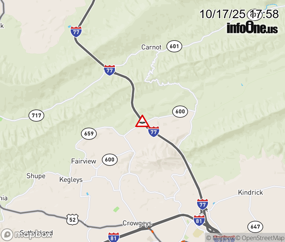 On I-77 at mile marker 45.3 in the County of Wythe, motorists can expect delays due to a vehicle crash. The north left shoulder and left lane are closed. Updated: Fri 10/17/25 5:58 PM EDT ![]() |