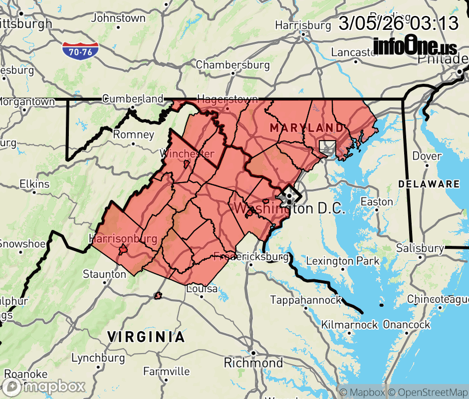 Canceled 3/5/26 4:26 AM Dense Fog Advisory issued March 5 at 3:12AM EST until March 5 at 10:00AM EST by NWS Baltimore MD/Washington DC * WHAT... Visibility one quarter mile or less in dense fog. * WHERE... Portions of central, north central, and northern Maryland, central, northern, northwest, and western Virginia, and panhandle West Virginia. * WHEN... Until 10 AM EST this morning. * IMPACTS... Low visibility could make driving conditions hazardous. ![]() |