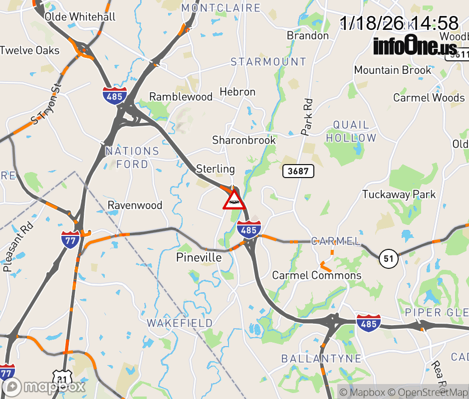 The ramp shoulder is closed at Exit 65A (South Blvd). Updated: Sun 1/18/26 2:58 PM EST ![]() Updated: Sun 1/18/26 2:58 PM EST |