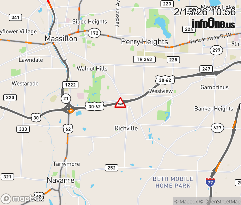 Expect lane closures on US-30/US-62 West beyond SR-627, due to a crash. ![]() |