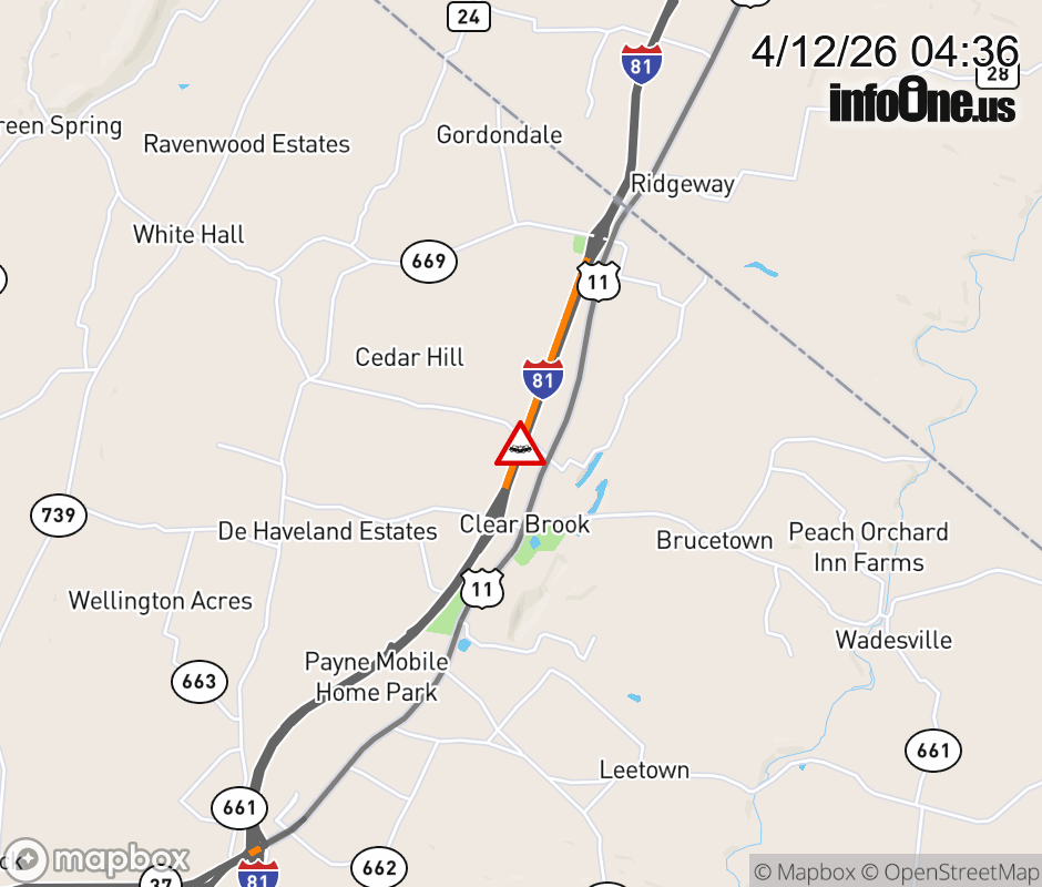 On I-81 at mile marker 322 in the County of Frederick, motorists can expect delays due to a tractor trailer crash. The south right shoulder is closed. Updated: Sun 4/12/26 4:36 AM EDT ![]() Updated: Sun 4/12/26 4:36 AM EDT |