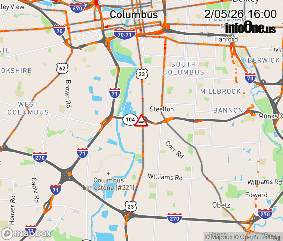 The right lane is blocked on SR-104 East at US-23/High St, due to a crash. ![]() |