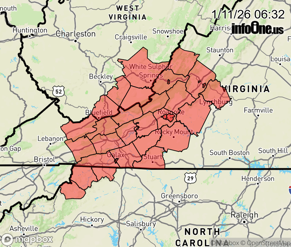 Canceled 1/11/26 8:40 AM Wind Advisory issued January 11 at 6:29AM EST until January 12 at 12:00AM EST by NWS Blacksburg VA * WHAT... Northwest winds 15 to 25 mph with gusts up to 50 mph. * WHERE... Portions of northwest North Carolina, central, south central, southwest, and west central Virginia, and southeast West Virginia. * WHEN... Until midnight EST tonight. * IMPACTS... Gusty winds will blow around unsecured objects. Tree limbs could be blown down and a few power outages may result. ![]() |