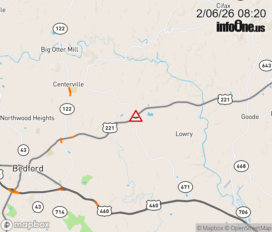 On US-221 North in the County of Bedford, in the vicinity of Centerville Rd; Timber Ridge Rd; Rt. 671E/W (Bedford County), motorists can expect delays due to a vehicle crash. Lane closures exist. ![]() |