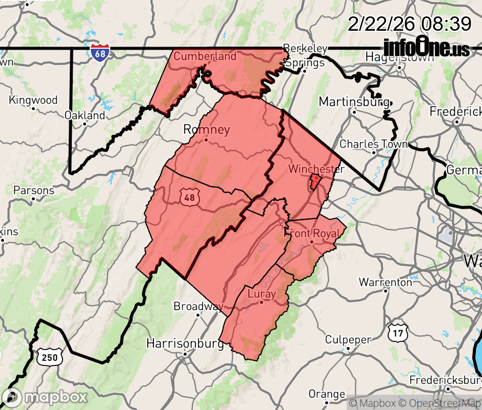 Canceled 2/22/26 2:07 PM Winter Weather Advisory issued February 22 at 8:38AM EST until February 23 at 7:00AM EST by NWS Baltimore MD/Washington DC * WHAT... Snow expected. Total snow accumulations between 1 and 3 inches in the valleys with 3 to 6 inches along the ridges above 1,000 feet. Northwest winds gusting around 30 to 45 mph tonight through Monday. * WHERE... Portions of western Maryland, northwest Virginia, and eastern West Virginia. * WHEN... Until 7 AM EST Monday. Snow will mix with rain in the valleys through 2 PM before changing to all snow between 2 pm and 5 PM. Snow is expected along the ridges. The steadiest snow is expected through this evening. * IMPACTS... Plan on slippery road conditions. The hazardous conditions could impact the Monday morning commute. * ADDITIONAL DETAILS... The combination of falling snow and blowing snow may cause visibility to drop below one-half mile at times tonight into early Monday, especially along the ridges above 1,000 feet. ![]() |