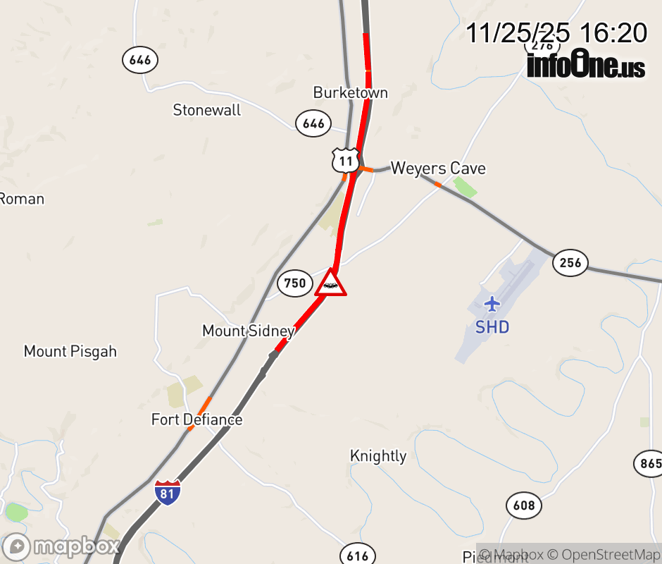 On I-81 South at mile marker 233.7 in the County of Augusta, motorists can expect delays due to a tractor trailer crash. Traffic backups are approximately 5.0 miles. Updated: Tue 11/25/25 4:20 PM EST ![]() Updated: Tue 11/25/25 4:20 PM EST |