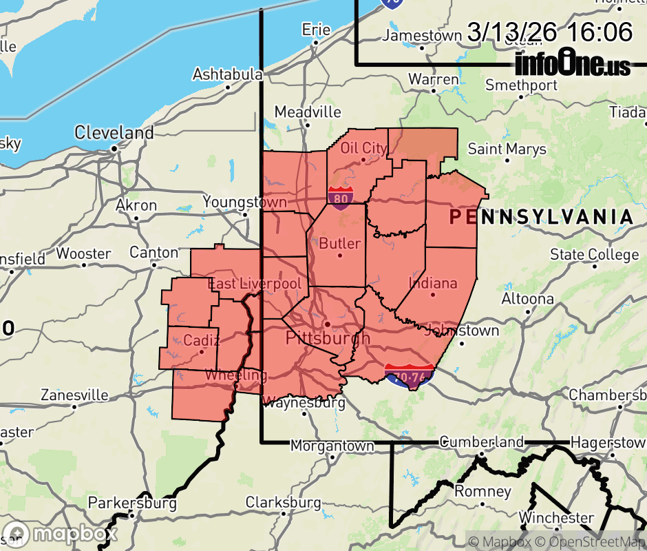 Canceled 3/13/26 10:31 PM High Wind Warning issued March 13 at 4:05PM EDT until March 14 at 12:00AM EDT by NWS Pittsburgh PA * WHAT... West winds 20 to 30 mph with gusts up to 65 mph. * WHERE... Portions of east central Ohio, northwest, southwest, and western Pennsylvania, and northern and the northern panhandle of West Virginia. * WHEN... Until midnight EDT tonight. * IMPACTS... Damaging winds will blow down trees and power lines. Widespread power outages are expected. Travel will be difficult, especially for high profile vehicles. ![]() |