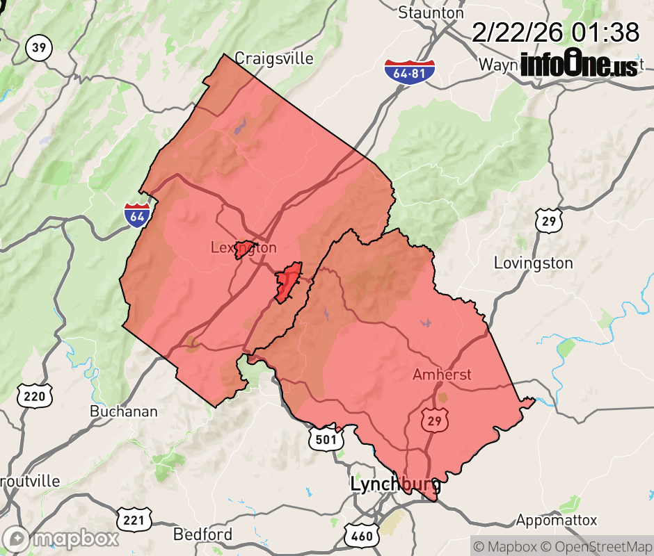 Canceled 2/22/26 1:52 AM Winter Weather Advisory issued February 22 at 1:37AM EST until February 23 at 7:00AM EST by NWS Blacksburg VA Low pressure will pass over the region today with rain changing to snow across the higher elevations. Arrival of colder air Sunday along with the development of a strong winter storm along the Mid-Atlantic coast will result in an extended period of snow showers and blustery winds across the mountains Sunday night through Monday night. * WHAT... Snow expected. Total snow accumulations an inch or less in the valleys but up to 6 inches along the Blue Ridge. Winds gusting as high as 45 mph. * WHERE... Amherst and Rockbridge Counties. * WHEN... From 6 AM this morning to 7 AM EST Monday. * IMPACTS... Plan on slippery road conditions. The hazardous conditions could impact the Monday morning commute. Gusty winds could bring down tree branches. ![]() |