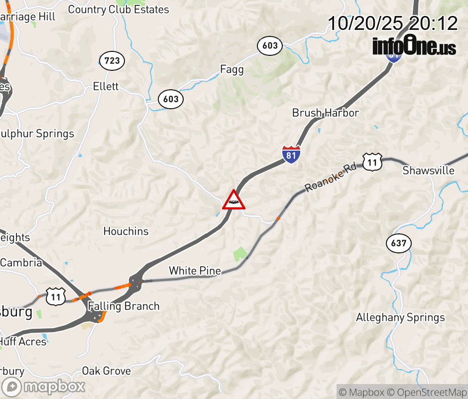 On I-81 at mile marker 121 in the County of Montgomery, motorists can expect delays due to a vehicle crash. The south left shoulder is closed. Updated: Mon 10/20/25 8:12 PM EDT ![]() Updated: Mon 10/20/25 8:12 PM EDT |