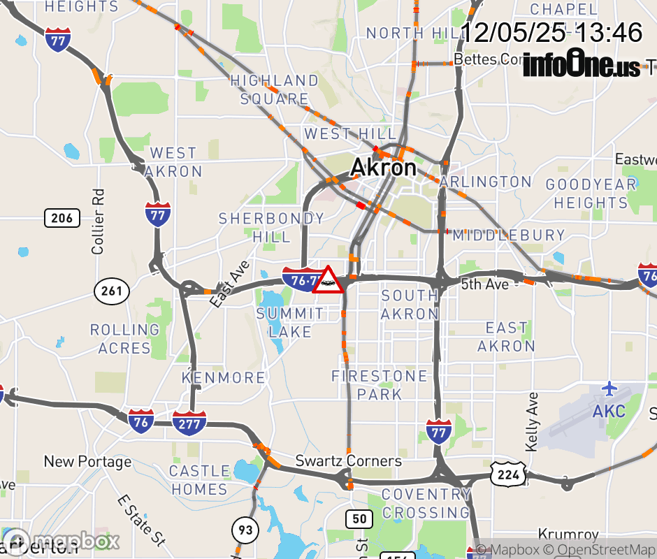 The right lane is blocked on I-76 West/I-77 North beyond Main St/Broadway/Downtown, due to a crash. Updated: Fri 12/5/25 1:46 PM EST ![]() Updated: Fri 12/5/25 1:46 PM EST |