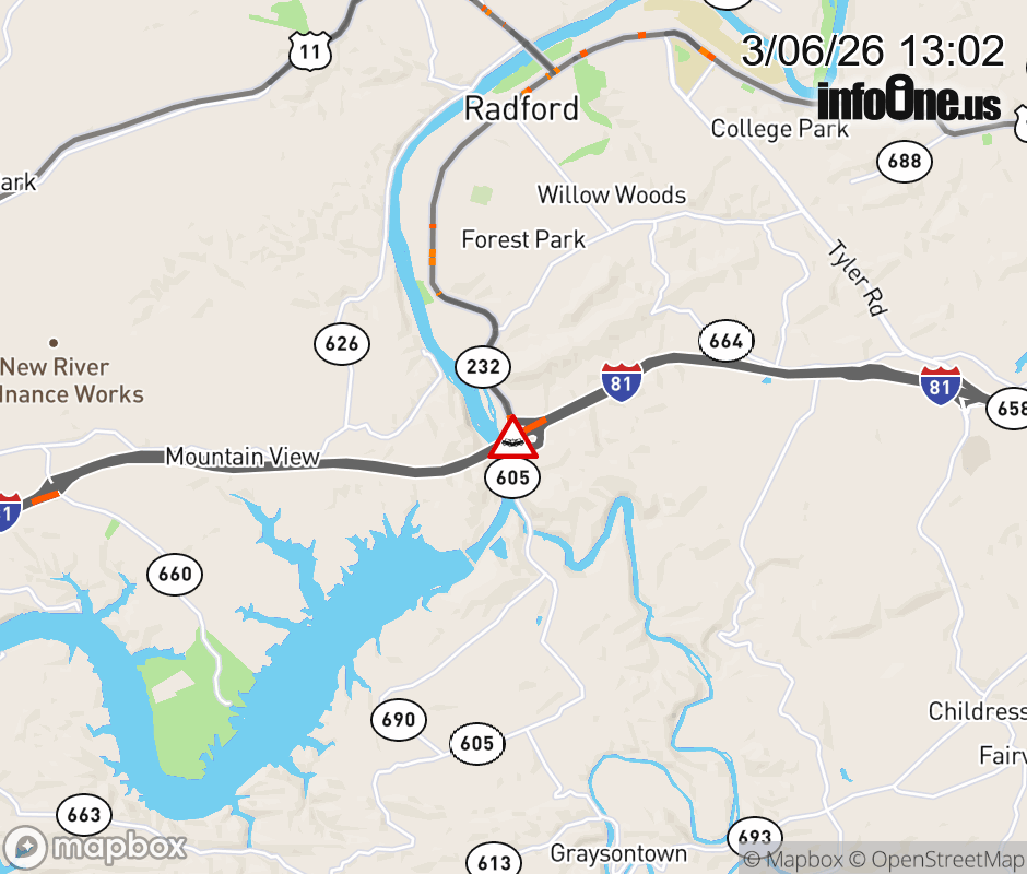 On I-81 at mile marker 105.2 in the County of Montgomery, motorists can expect delays due to a vehicle crash. The south right shoulder is closed. ![]() |