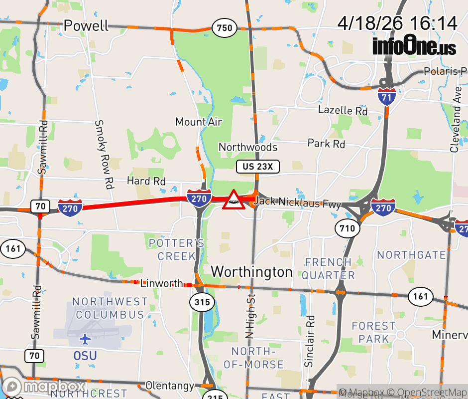 The left lane is blocked on I-270 West beyond SR-315 South, due to a crash. ![]() |