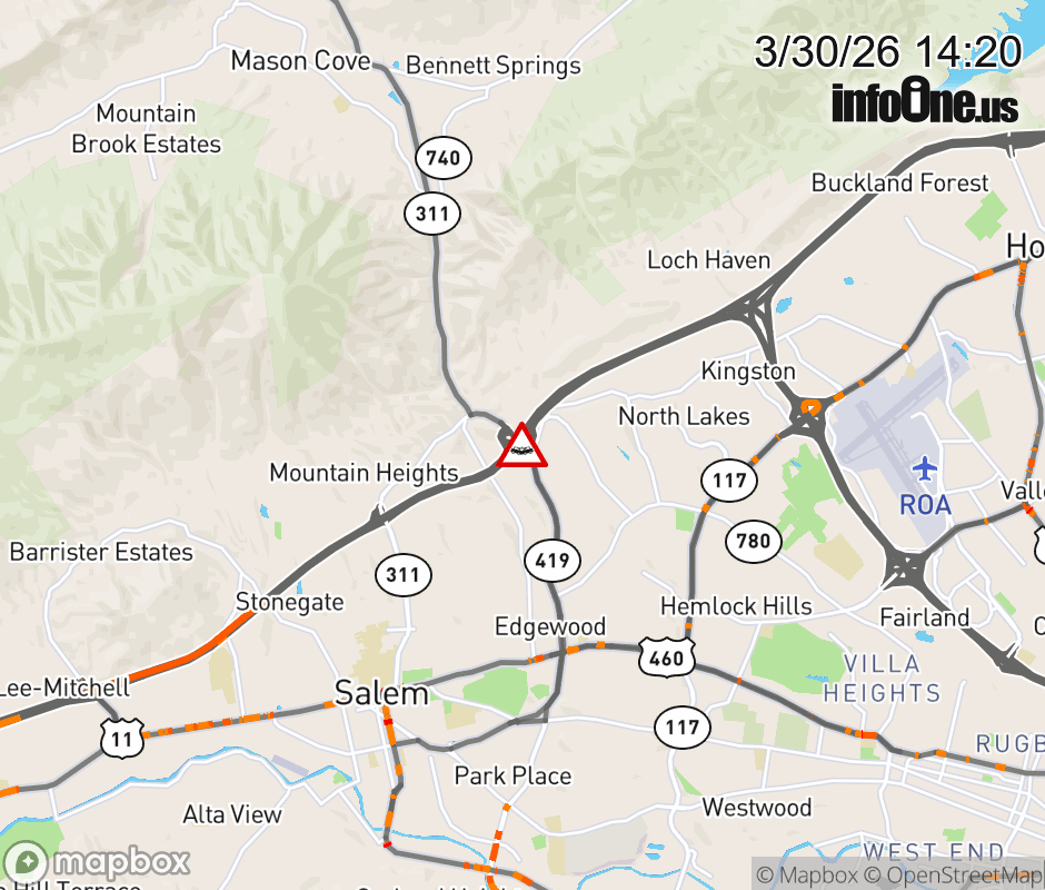 On VA-419 in the County of Roanoke, in the vicinity of Cove Rd; Rt. 780N/S (Roanoke County), motorists can expect delays due to a vehicle crash. All south lanes are closed. ![]() |